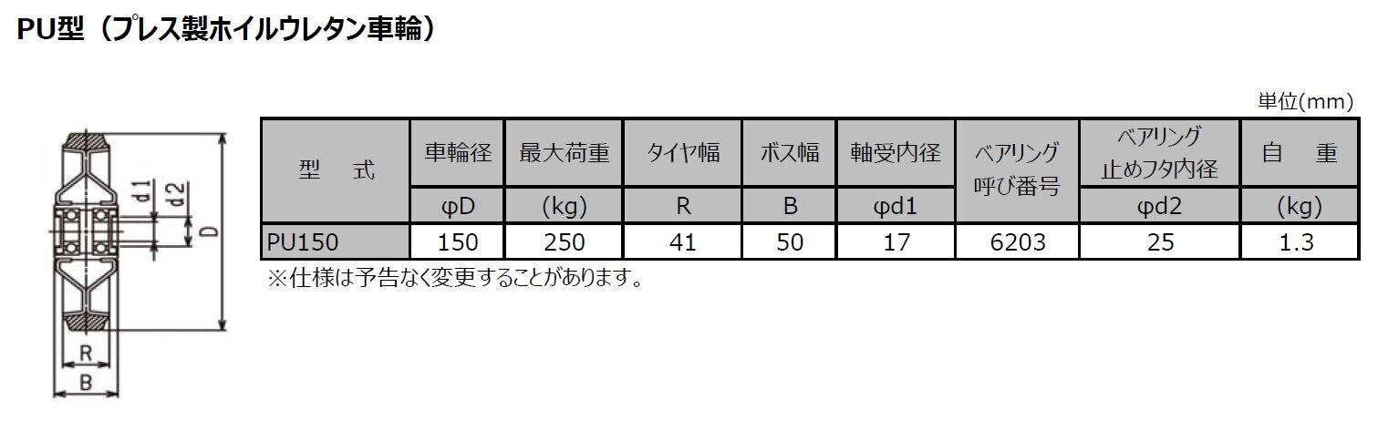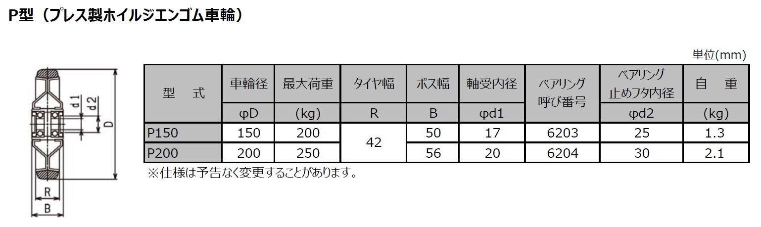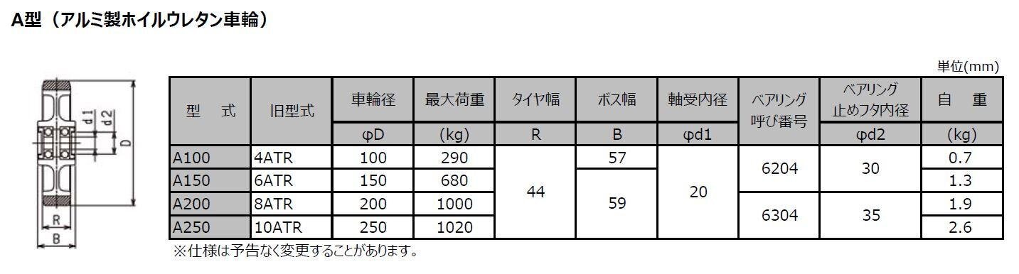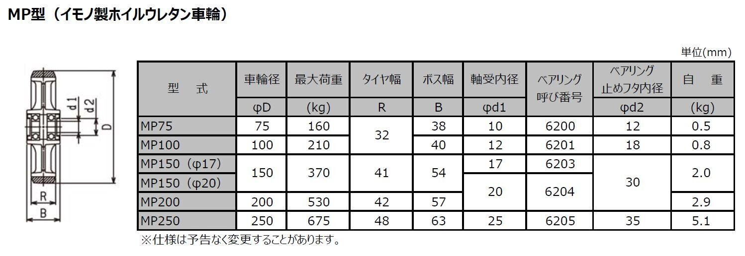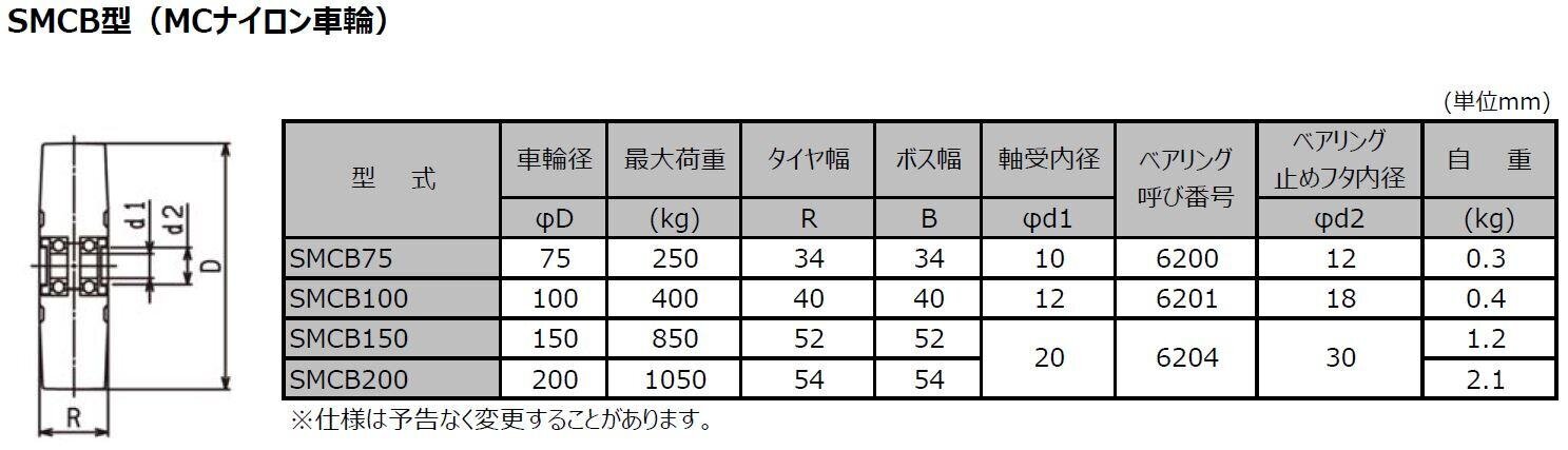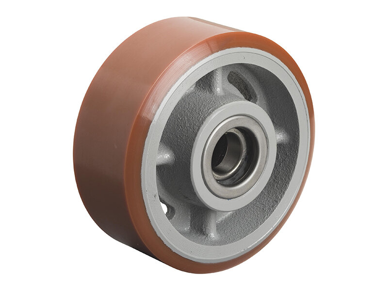 - 重荷重用で耐熱・耐寒・耐油・耐水・耐薬品とほとんどの環境に適する万能型で、耐摩耗性にも優れ、始動、走行抵抗が小さく非常に軽く動く