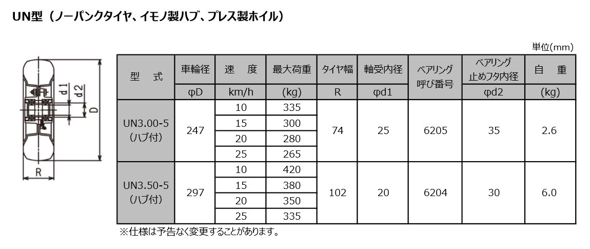 UN型(ノーパンクタイヤ、イモノ製ハブ、プレス製ホイル) -